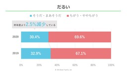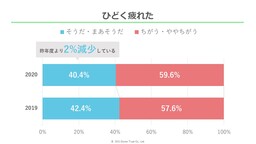 コロナ禍のため従来と就業環境が大きく変わった人も少なくありません。慣れない環境のため疲労感は大きくなると予想していたのですが、2020年度の結果では疲労感は少ないほうに変化していました。仕事量が減ったことも考えられますが、在宅勤務によって通勤がなくなったことに伴う疲労軽減、あるいは社内コミュニケーションが億劫な人にとっては気疲れが減った可能性も考えられます。