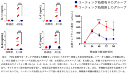 次に、コーティング処理した腎臓の効果を調べるために、腎移植後6時間と4日間の経過観察を行なったブタ腎移植モデルを用いて、移植後の評価を行いました(図3)。レシピエントブタにコーティング処理した腎臓を移植すると、移植直後にはコーティング膜は腎臓内で残存しており、半減期が14時間で、移植2日後にはほぼ消失することが確認できました。これは細胞膜に導入されたPEG脂質が徐々に脱離していくためと考えられます。移植後4日間経過のレシピエントブタの血液検査を行ったところ、コーティング処理有りのグループでは、補体系(C3a、sC5b-9)と凝固系パラメーター(TAT)、サイトカイン類(TNF、IL-1、IL-2、IL-4、IL-6、IL-10、IL-12、IL-18、IFN-)の値が、コーティング処理無しのグループと比較すると、統計的に有意に低いことが分かりました(図3左)。このことは、移植直後に起きる自然免疫が中心となる免疫反応の活性化や凝固反応が抑制されていることを示しています。また、腎機能の指標となる血漿クレアチニンを測定したところ、コーティング処理有りのグループではクレアチニンの値が統計的に有意に低く、移植後の腎機能が迅速に回復したことが示されました(図3右)。これらの結果から、コーティング処理有りのグループでは免疫系からの攻撃を防御することで、細胞機能の保護や血栓形成が回避でき、移植した腎臓が相応に機能していることが示唆されました。