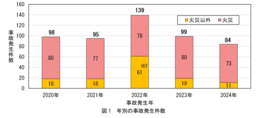 調理家電の事故における「年別の事故発生件数」を図1に示します。火災事故が多く、全体の約75%(515件中388件)を占めています。