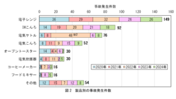 調理家電の事故における「製品ごとの事故発生件数」を図2に示します。例年「電子レンジ」、「IHこんろ」の事故が多く発生しています。