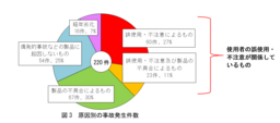 調理家電の事故515件のうち、調査中の事故(78件)及び原因不明の事故(217件)を除く220件についての「原因別の事故発生件数」を図3に示します。調理家電の事故は、使用者の誤使用・不注意が関係しているものが最も多く、事故原因の約4割を占めています。