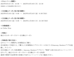 期間中にau Online Shopで「Samsung Galaxy Tab S11シリーズ」をご購入いただきますとSamsungオンラインショップで使用できる純正スリムキーボードカバー引き換えクーポンをプレゼントいたします。