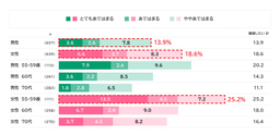 50代後半は「孤独」や「離婚」を意識するなど老後に向けて不安や迷いを感じており、反応に男女差はあるものの、人生の転換期における心の揺れが垣間見えます。しかし、高齢でも「新しいことに挑戦したい」シニアは多く、還暦後は「人生の点数」も高得点になり、新しい楽しみや役割を見つけて前向きに過ごすのが令和シニアらしい生き方となっています。