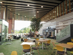 天井高のあるガラス張りの開放的な構造を生かし、中央には4mのシンボルツリーを配置。緑の映えるおしゃれで落ち着いた空間が誕生しました。授業の空き時間にリラックスしたり、仲間でおしゃべりしながら課題に取り組んだり、セミナーやワークショップに参加したりと、一人でもグループでも、心地よく過ごせる“場”を提供します。