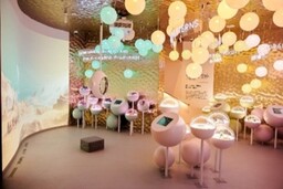ポーランドと日本をつなぐ 6 つの産業を紹介する 1 階の「創意の園」では、化粧品や製薬、ゲームなど、未来を支えるイノベーティブな産業・文化を紹介。白を基調とした有機的なデザインの空間に多数の球体が配置され各産業を紹介しています。中では、「 The Witcher (ウィッチャー)」や「 Cyberpunk 2077 」など人気の RPG ゲームシリーズを生んだポーランドのゲーム産業にも触れており、来場者は、分野を越えてつながるポーランドの創造力と未来へのビジョンを体感することができます。