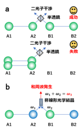 b 和周波発生が起きた時にはA2とB1に1光子ずつ存在するため、量子もつれ交換の成功が判別できる。