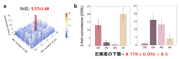 その結果、和周波光子の信号は高いSN比で検出され(図3a参照)(先行研究[2]と比較して約1桁近く高いSN比を達成)、終状態に強い量子もつれが存在していることを確認し(図3b参照)(最大量子もつれ状態との忠実度の下限を推定すると0.770±0.076)、世界で初めて単一光子間の和周波発生による量子もつれ交換の実証に成功しました。
