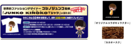 コシノジュンコ氏監修のTシャツ「JUNKO KINOKO Tシャツ」が当たるキャンペーンを実施します。きのこの山のチョコレート部分とコシノジュンコ氏のキャラクターを掛け合わせたオリジナルコラボキャラクター「JUNKO KINOKO」をプリントし、生地をカカオハスクで染めています。