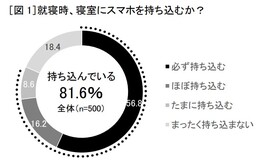 日常的にスマートフォンを利用する15歳〜69際の男女500人を対象に、アンケート調査を行いました。就寝時にスマートフォンを寝室に持ち込むかと聞くと、6割近くが「必ず持ち込む」(56.8%)と答え、「ほぼ持ち込む」(16.2%)、「たまに持ち込む」(8.6%)を加えると、全体の81.6%がスマホを寝室に持ち込んでいます[図1]。寝ても覚めてもスマホを手放さない(手放せない?)様子がうかがえます。