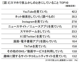スマホの利用で夜ふかしをした経験がある326人に、何をしていて夜ふかしをしたのかを聞きました。すると、「YouTubeを見ていた」(42.3%)、「ネット検索をしていた(調べもの)」(35.3%)、「Instagramを見ていた」(27.6%)が上位に挙げられました[図3]。