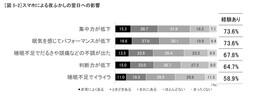 また、スマホによる夜ふかしの翌日への影響について聞くと、 7 割以上が「集中力が低下」( 73.6 %)したり、「眠気を感じてパフォ ーマンスの低下」( 73.6 %)した経験があると答え、「睡眠不足でだるさや頭痛など身体的な不調が出た」( 67.8 %)を訴える人も 6 割を 超えています[図 5-2 ]。このような影響を実感しながらもなかなかやめられない…。スマホによる夜ふかし問題の根深さが垣間見える結果です。