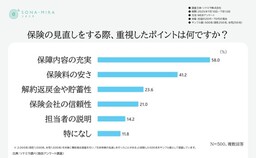 「保険の見直しをする際、重視したポイントは何ですか?」という問いでは、「保障内容の充実」が58.0%で断トツのトップとなり、次いで「保険料の安さ」が41.2%でした。