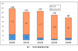 NITEが受け付けた主な暖房器具の製品事故情報について、年別の事故発生件数を図1に示します。毎年約8割以上が火災の製品事故となっており、毎年100件前後発生しています。