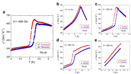 本研究では、高純度(5N)のPb線とAl線をSn-Pbハンダで接合し、有効熱伝導率(κ*)[8]を測定しました。図2(a)に測定セットアップ(順方向)を示します。ヒーターで温度差を生じさせ、温度差と熱流量から有効熱伝導率の温度依存性を測定しました。例えば、接合の中央がPbの超伝導転移温度(H = 0 Oeで7.2 K、H = 400 Oeで5.2 Kのように磁場印加で低下する)のとき、図2(b)に示す通り順方向測定ではPb線も常伝導状態のため高い有効熱伝導率を示します。一方、逆方向の場合はPb線が超伝導状態となるため、有効熱伝導率が低くなります。この違いを利用することで熱整流が実現します。