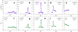 図4. 順方向と逆方向の有効熱伝導率差(Δκ*)と熱整流比(TRR)の温度依存性。印加磁場はH = (a,f) 0 Oe, (b,g) 200 Oe, (c,h) 400 Oe, (d,i) 600 Oe, (e,j) 800 Oe。H = 400 Oeの時に最大の熱整流が見られた。