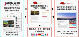 本サービスでは、一般社団法人共同通信社の英語ニュースサイト「Japan Wire」において、地域の文化・自然・歴史等の魅力を包括的に紹介する特集記事広告を発信します。あわせて、ジャパン・トラベルの外国人ガイドが対象地域を訪問し、旅行者目線による旅行プランを作成。これらのプランは、予約機能を備えた専用ウェブサイトに掲載するほか、ジャパン・トラベルが連携する欧米の旅行事業者にも提供され、訪日観光客の誘致につながる導線を構築します。