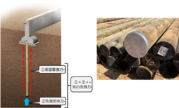 軟弱地盤における住宅等での地盤補強⼯法は大きく分けると、鋼製やコンクリート製等の杭状の補強材を打ち込む工法と、地盤そのものをセメントなどで固める工法があります。「環境パイル工法」は木製の杭状の補強材を打ち込む工法で、杭と杭周囲の土の摩擦によって生じる周面摩擦力と安定した地盤まで先端を到達して支持する先端支持力によって、建物を支持する工法です。「環境パイル工法」は特性上、先端支持力の確保が難しく、杭長が短くなる地盤条件下では十分な周面摩擦力が得られず、支持力が小さくなり、採用しづらいという課題がありました。今回開発した「SH-KPパイル工法」では、地盤調査の方法や杭先端の形状を工夫することで、「環境パイル⼯法」と比べて高い先端支持力が確保でき、適用可能な地盤の範囲拡大に成功しました。