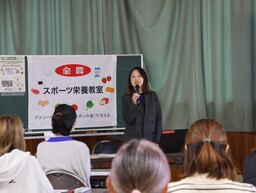 指導者講習会ではトレーナーの吉田直人氏が、各チームの指導者18名に対してケガを予防するためのストレッチやトレーニング方法について実技を交えて講義を行いました。スポーツ栄養教室では、管理栄養士の阿部菜奈子氏が保護者24名を対象に成長期の子どもに必要な栄養やそれらの栄養の上手な取り入れ方、参加賞としてお渡ししたお餅の効能などについて講義を行いました。