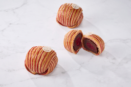 バリっとした食感が特長のブリオッシュフィユテ生地に、ピスタチオクリーム、ドライ苺とフレッシュ苺を苺ジャムで一晩マリネしたもの、さらにシロップ漬けの苺を重ねた、「苺尽くし」のパンです。苺の凝縮された甘みと、ピスタチオとのマリアージュをお楽しみください。