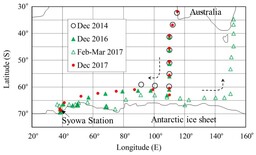 国立極地研究所の平沢尚彦助教を中心とする研究グループは、2014-17年の夏季に南極観測船「しらせ」や昭和基地及び南極大陸上の地上観測から、主に成層圏で生成される放射性同位元素ベリリウム7(⁷Be)の日単位及び半日単位の高い時間解像度のデータの取得に成功しました。その結果、低気圧・高気圧システムに関連する対流圏界面の折れ込みによって成層圏の大気が周期的に地上付近に輸送されることや、大陸上を吹き降りる風(カタバ風)が成層圏の影響を受けた大気を輸送することを初めて明らかにしました。この成果は南極域の大気循環に伴う物質輸送の基本的な仕組みとして今後に残る知見です。