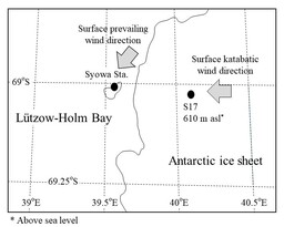 南極氷床上のS17観測拠点では半日ごとにフィルタを交換したところ、⁷Be濃度は夜間(21~9時LT)に高く、昼間(9~21時LT)に低い傾向が捉えられました(図4a)。図4bから⁷Be濃度の高い夜間に東風(内陸からの風)が強く、昼間には風が弱くなることが分かります。この夜間の風はカタバ風と呼ばれ、数100 kmもの内陸から大気の最下層を吹き降りてきます。内陸でカタバ風が加速するときに必然的に上空の大気を取り込みますが、内陸の標高は3000mを越え⁷Beの生成域により近いため、取り込まれるのは⁷Be濃度の比較的高い大気です。このようにして⁷Beが沿岸域まで輸送されていると考えられます。この結果は南極氷床表面付近に形成されているカタバ風が成層圏と繋がった大規模な物質輸送に関わっていることを示します。