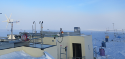 図2: 南極氷床上のS17観測拠点。左の建物の屋根に乗っている装置(白丸で示す)はフィルタを通して空気を吸引することによって⁷Beを含む空気中の物質をフィルタに吸着させる。右奥に気象観測設備がある。