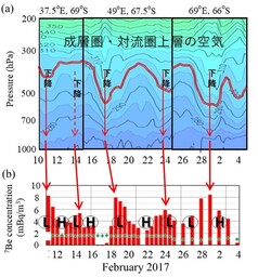 高層大気中で宇宙線により生成された⁷Beは、低気圧・高気圧システムに関連して発生する対流圏界面の折れ込み現象により地上付近に輸送され、また、南極大陸の斜面を吹き降りるカタバ風に取り込まれて沿岸の地上付近に輸送される。