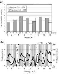 図4: (a) 南極氷床上のS17観測拠点の⁷Be濃度の12時間間隔の時系列、及び日中(9~21時LT)と夜間(21~9時LT)の平均濃度と標準偏差を左上の枠内に示す。(b) 地上の風速(線)と風向(黒丸)の時系列。夜間(21~9時LT)に灰色の陰を付加する。
