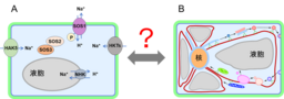 植物は移動できないため、乾燥・高塩・低温などの非生物的ストレスに適応するための高度な防御システムを進化させてきました。特に土壌の塩濃度上昇による塩ストレスは、植物体内のイオンバランス(Na⁺/K⁺比)の破綻や酸化的損傷を引き起こし、成長阻害や枯死の主要因となります。これまでの研究により、植物は細胞膜に存在するナトリウム輸送体(SOS1、NHXなど)を介して過剰なNa⁺を排出または隔離することで、細胞内のイオン恒常性を維持していることが知られています(図2A)。