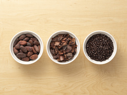 左よりカカオ豆、カカオ種皮、 カカオバイオプラスチック