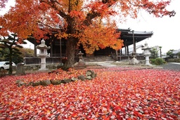 親鸞聖人ゆかりの古寺。秋には境内のハナノキとイチョウがそれぞれ赤・黄に染まり、寺を優しく彩ります。歴史を感じる紅葉の情景が広がる静かな癒しの空間です。