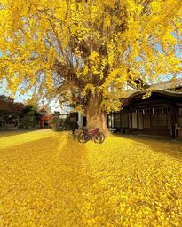 境内を包む大イチョウが一斉に黄葉し、足元には黄金のじゅうたんが広がります。由緒ある神社で、天平年間に創建されたと伝わり、歴史と自然の調和が美しい場所。地元で長く愛される秋の風景です。