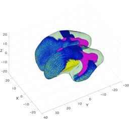 本研究では、妊娠19〜22週に撮像された胎児MRI画像をもとに、脳室表面から皮質板の下層表面(白質側の内面)へと伸びる“仮想的な足場”を全脳スケールで計算しました。評価にあたっては、①足場の向き(どの方向に足場が伸びやすいか)、②供給量(脳室側からどれだけニューロンが供給されるか)、③発生の勾配(ニューロンがどの領域で生まれやすいか)の三つの要素を統合しました。さらに、大脳基底核や視床によって実際には通過しにくい経路を除外することで、現実に近い移動経路をモデル化しました(図1、2)。得られた値を皮質内面に投影することで、「その場所に流入し得るニューロンの多さ」を示す地図を作成しました。解析は二つのモデルに分けて検証しました。