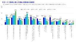 サポートで負担に感じた理由を年代別に分析したところ、ケアラーのライフステージによって負担の内容が異なることが明らかになりました。年代が高くなるほど「自分の精神的な負担が大きかった」の回答割合が高く、60代以上(47.1%)で最も多い結果となりました。50代では「時間的制約があり、自分の生活との調整が難しかった」(38.6%)が最も多く、20・30代で他世代より回答が多かった項目は「協力(分担)できる人がいなかった(少なかった)/人手が足りなかった」(28.1%)、「"やり方(何をどうすれば良いか)"がわからなかった」(25.8%)、「相談できる人がいなかった(少なかった)」(21.3%)でした。