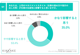 「Q1.あなたは、上司のマネジメントスタイル(仕事の進め方や指示の出し方等)が仕事の生産性に影響すると思いますか。」(n=431)と質問したところ、「かなり影響すると思う」が35.0%、「やや影響すると思う」が53.4%という回答となりました。