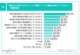 Q2で「非常に満足している」「おおむね満足している」と回答した方に、「Q3.現在の上司のマネジメントに満足している理由を教えてください。(複数回答)」(n=290)と質問したところ、「作業の優先順位付けを自分で決められるから」が49.7%、「要件や期待値を明確に伝えてくれるから」が37.2%、「技術的な判断や実装方法を任せてくれるから」が35.9%という回答となりました。
