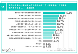 Q2で「やや不満である」「非常に不満である」と回答した方に、「Q5.現在の上司の仕事の進め方や指示の出し方に不満を感じる理由を教えてください。(複数回答)」(n=122)と質問したところ、「要件があいまいで何度も確認が必要だから」が42.6%、「成果を正当に評価してくれないから」が31.1%、「予期せぬ問題を想定せず余裕のない計画を立てるから」が29.5%という回答となりました。