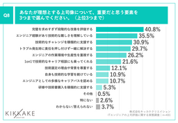 「Q8.あなたが理想とする上司像について、重要だと思う要素を3つまで選んでください。(上位3つまで)」(n=431)と質問したところ、「完璧を求めすぎず段階的な改善を評価する」が40.8%、「エンジニア経験があり技術的な難しさを理解している」が35.5%、「技術的なチャレンジを積極的に支援する」が30.9%という回答となりました。