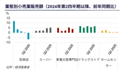 2025年第3四半期の実質GDPは、米国の輸出関税発動前の駆け込み輸出の反動で輸出が減 少等が見込まれ前期比年率-3.9%の落ち込みが見込まれている¹。2025年9月のコアCPIは前年 比+2.9%と直近ピーク(2025年5月+から3.5%)から鈍化して推移。 勤労世帯実収入は前年 同期比0.1%の減少だったが、インフレ緩和に加え賃上げの浸透も影響し前期の年間の減少幅 (0.8%)を下回った。消費者態度指数も、5%以上の物価上昇を回答者の約半数が見越しな がらも、8月から3ヶ月連続で緩やかな改善²。一方、2025年第3四半期の全国小売販売額は前 年同期比横ばいであり、実質減少。販売業態別では引き続き生活必需品の売上が好調だったド ラッグ・ストアが同4.7%増で最も高い上昇率を記録したが、百貨店は同1.4%減少。円高進行や 高額品値上げにより免税売上を中心に2月から7月まで減少が継続。しかし、8月以降円安等の 影響で免税売上の減少幅が縮小、商品別では時計・宝飾等高額品の売上が比較的好調に推 移³し、四半期全体では前期の年間の減少幅(6.8%)を下回った。