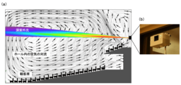 (a)大型ホール内の空気の流れと深紫外光の照度分布、 (b)大型ホールに設置された深紫外LED照射モジュール