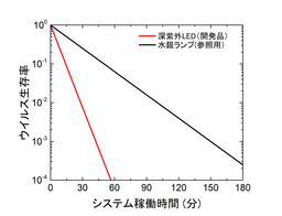 さらに、本大型ホール(容積:9,200 ㎥)内の空気中を浮遊するウイルスの不活性化に必要な時間を評価した結果、本システムを用いて試験用ウイルス(ヒトコロナウイルス229E)を99.9%不活性化する場合、要する時間は42分と見積もられました。また、今回開発した深紫外LED大空間殺菌システムは、水銀ランプを使用した場合に比べ、そのウイルス不活性化に要する時間を大幅に短縮(72%減)できることを明らかにしました。