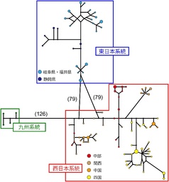 着色された円はハプロタイプおよびその採集地域を示す。線上の数値はハプロタイプ間の変異塩基数を示す。西日本系統・東日本系統・九州系統はいずれも明確に分化している。