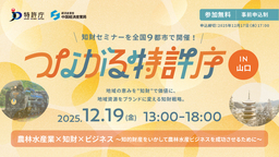 令和7年度第6回目となる「つながる特許庁 in 山口」では、セッション①【講演】知財を活用した農産品の競争力強化~農林水産業の知財マネジメント~ セッション②【講演】小さな生業からの持続可能な地域づくり~農林水産事業者による知財活用術~ セッション③【パネルディスカッション】山口農水ビジネスの発展に向けて~農林水産ビジネスの現状と知財活用による未来~ をテーマに、企業の取組について情報発信します。