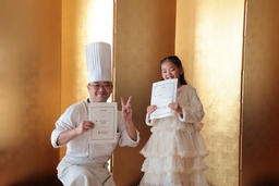 贈呈式では、ホテルパティシエが実現した夢のケーキに加え、表彰状と賞品を贈呈。受賞者のおおぶち こはる様からは「うれしい!自分の絵がえらばれるなんてうそかと思った!最初に星の部分を食べたい。」と、かわいらしい喜びの声をいただきました。保護者の方からは、「第1回目のコンテストから応募を続けていて、本人も“これだけは絶対に叶えたい”と言って諦めずに取り組んでいました。スカイビュッフェ51のスイーツの色やグラデーションが大好きで、パティシエさんが作るケーキをよく観察していて、自分の絵にもそれを取り入れるなど工夫していました、選んでいただいて本当に喜んでいます。」とコメントをいただきました。