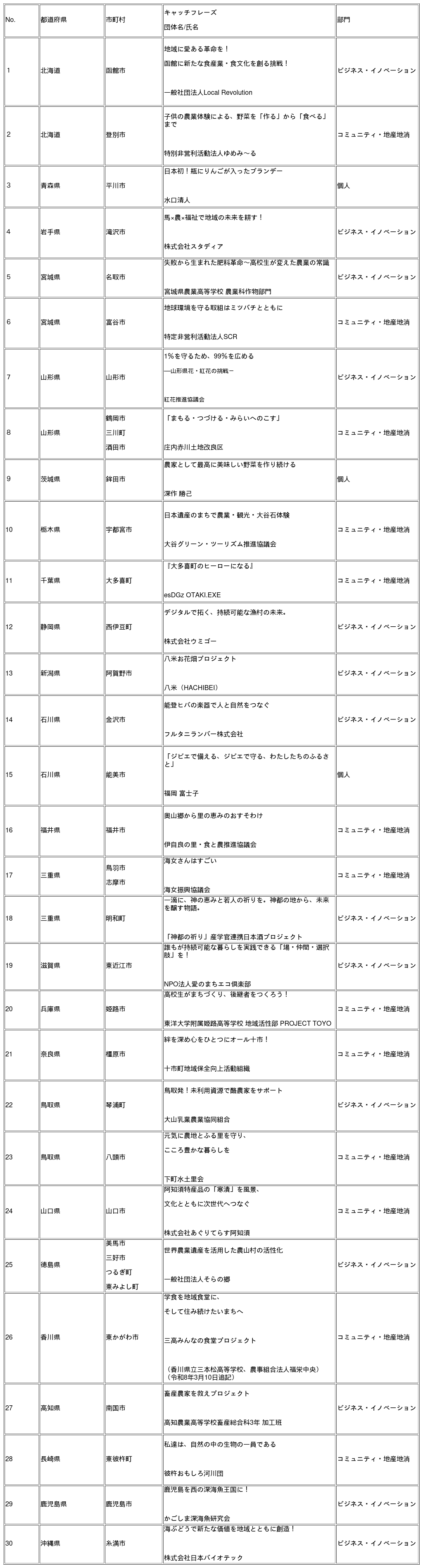 令和7年11月18日(火曜日)に開催された「ディスカバー農山漁村(むら)の宝」(第12回選定)有識者懇談会において、地域の活性化や所得向上に取り組んでいる優良事例30地区を選定し、このうち特に優秀な事例については、グランプリ及び優秀賞として決定しました。