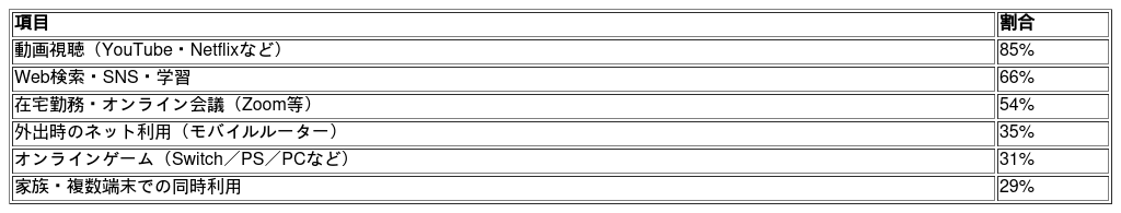 動画視聴が85%と突出しており、SNSやオンライン会議など高品質な通信を求める利用が中心となっています。日常的に負荷の高い通信が増えている中、安定した接続環境へのニーズが強まっていることが明らかです。
