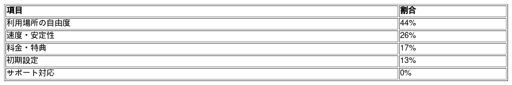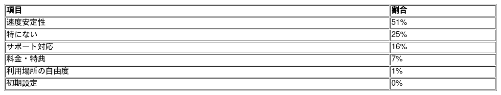 不満点の中心は「速度・安定性」で、通信品質の改善が最大の期待ポイントとなっています。多くのユーザーが、より快適で安定したインターネット環境を求めていることが明らかになりました。