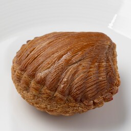 折り重ねたブリオッシュ生地に、焼いても溶けないビターチョコレートのガナッシュを包み、マドレーヌ型で可愛く帆立貝の形に焼き上げました。生地の表面にソルティーシロップを塗ることで、ビターチョコレートの味わいを引き立てています。