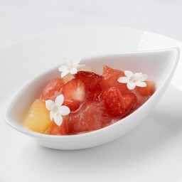 カカオパルプピューレでマリネしたグレープフルーツと苺に、マスカルポーネと生クリーム、カスタードクリームを合わせました。食べる機会が少ないカカオパルプはパッションフルーツやライチに似たフルーティーな酸味があり、クリームの甘みとの調和もお楽しみいただけます。