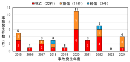 除雪機により人的被害があった事故38件について、「年度別の事故発生件数」を図1に示します。2023年度に0件になったものの、2024年度に再び事故が発生しました。降雪量が増え、使用機会が増えると事故件数も増加するおそれがあります。事故の9割以上(38件中36件)が、死亡又は重傷に至っており、注意が必要です。